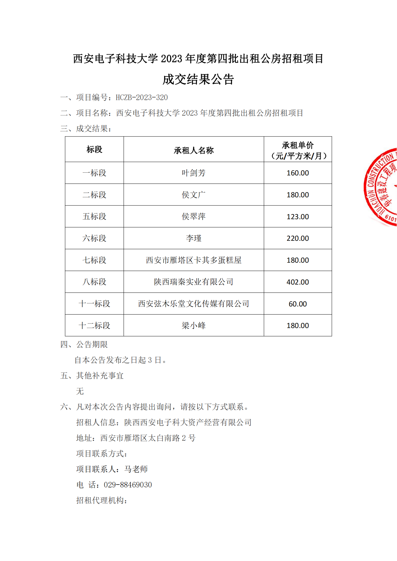 西安電子科技大學(xué)2023年度第四批出租公房招租項(xiàng)目成交結(jié)果公告